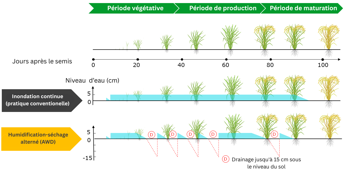 Développé à Madagascar dans les années 80 par le père Henri de Laulanié, le SRI se distingue des méthodes de production classiques en mettant l’accent sur la qualité de la croissance des plantes plutôt que sur la quantité d'intrants. Cette méthode a été mise au point en réponse à une contrainte; le père de Laulanié s'étant donné pour mission d'aider les agriculteurs malgaches à améliorer leur productivité sans dépendre d'intrants externes coûteux. Contrairement aux systèmes de riziculture inondée, qui créent des conditions anaérobies et donc des émissions de méthane, la méthode SRI utilise des techniques d'alternance d'humidification et de séchage (AWD) – ou plus simplement, irrigation intermittente – afin de maintenir les sols dans un état aérobie. Cette pratique consiste à laisser l'eau de surface des rizières s'évaporer pendant environ 1 à 10 jours, avant d'irriguer le champ à nouveau. Cela réduit non seulement la quantité d’eau nécessaire à la production de riz, mais empêche également la méthanogénèse de se produire dans le sol, réduisant ainsi la quantité de méthane rejetée dans l'atmosphère. En effet, certaines études ont démontré que le SRI permettait de réduire la consommation d'eau jusqu'à 50% et les émissions de méthane jusqu'à 40%.